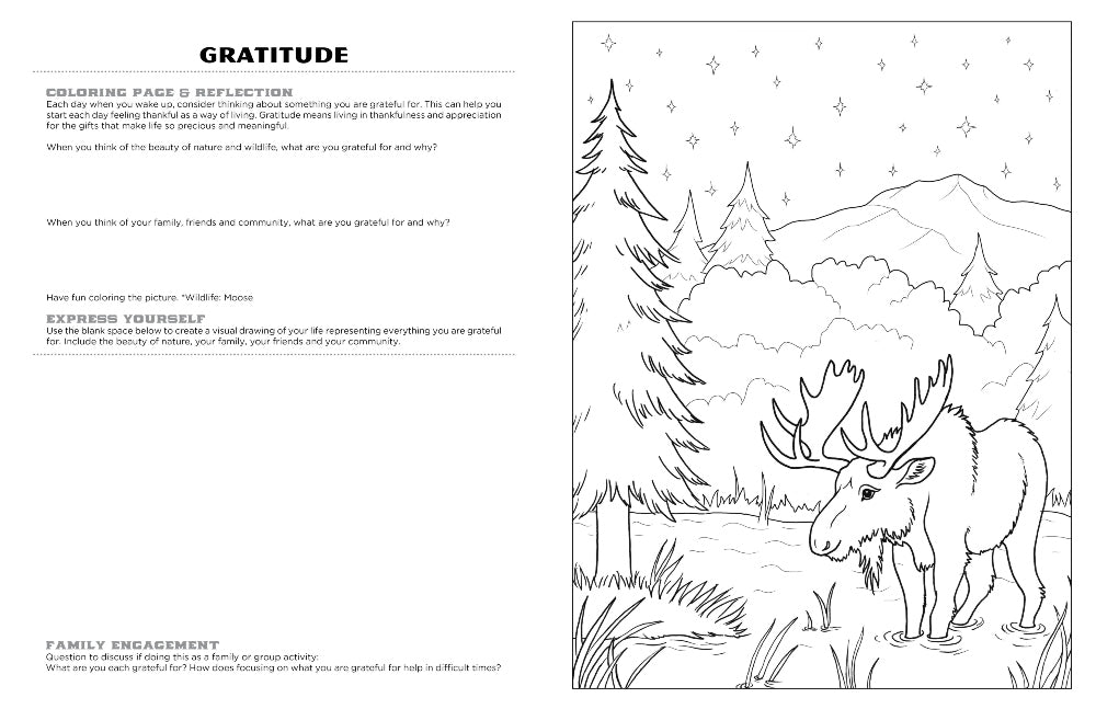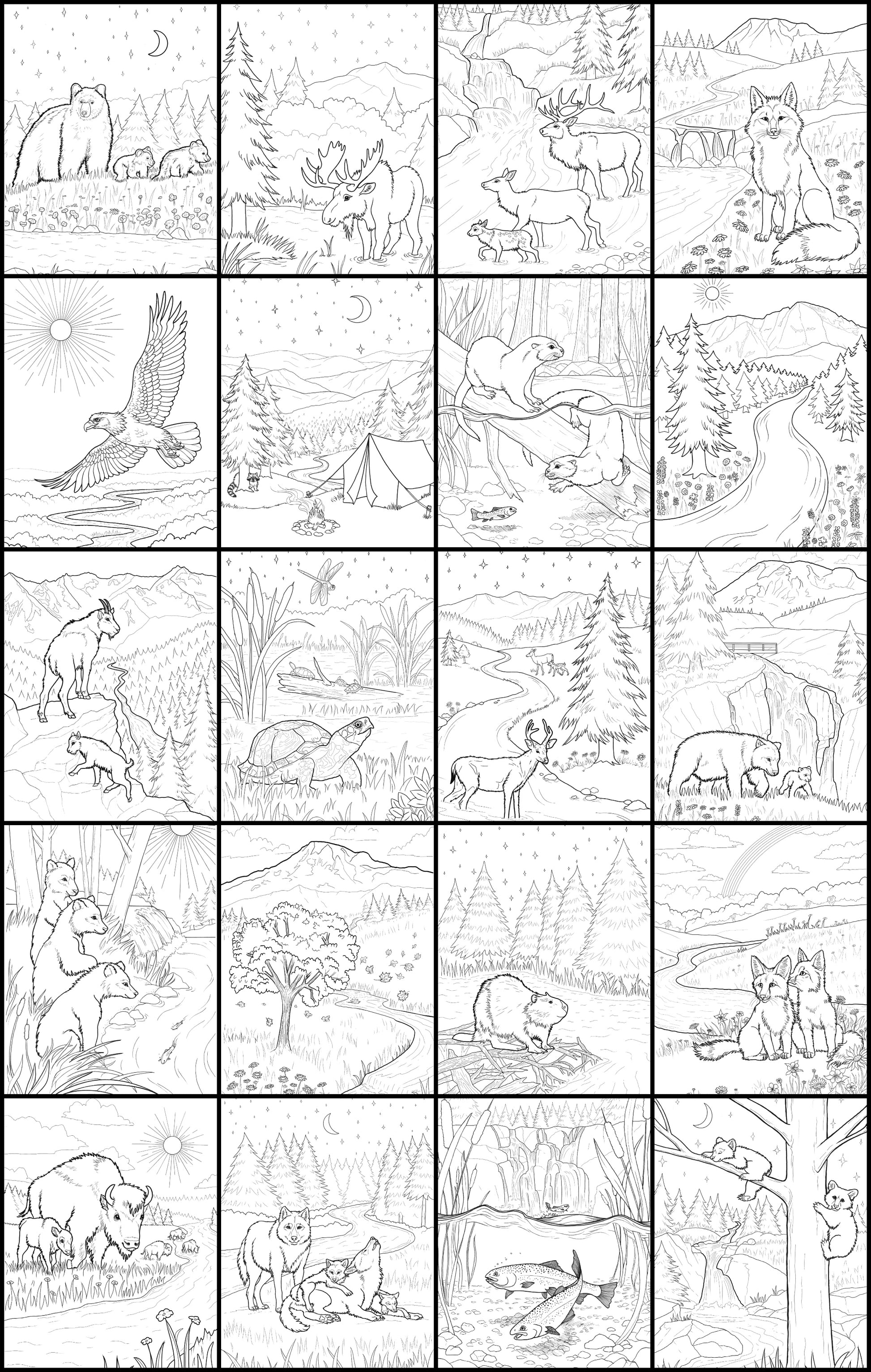 Right side has a beautiful coloring page of nature and wildlife by rivers.